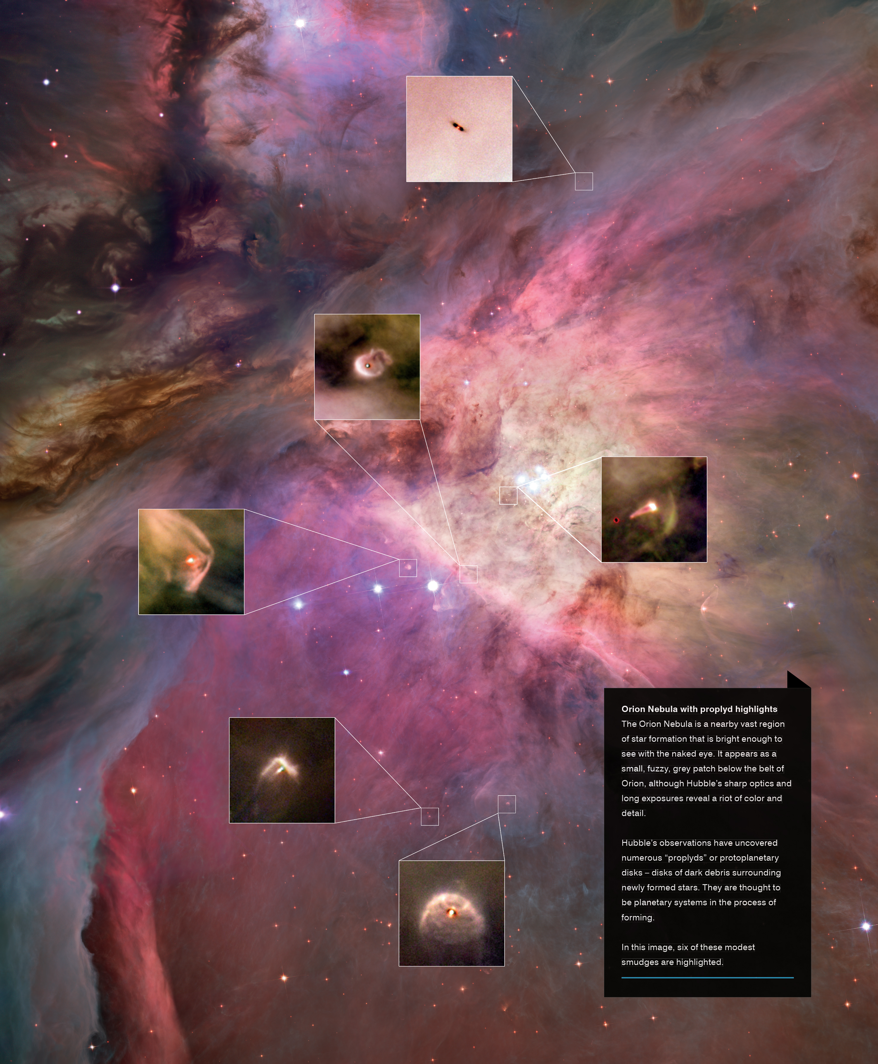 ![]() Orion Nebula with proplyd highlights (page 51) High-res TIF (13.9 MB) High-res JPG (5.1 MB) Original images: 1, 2, 3, 4, 5, 6, 7 |