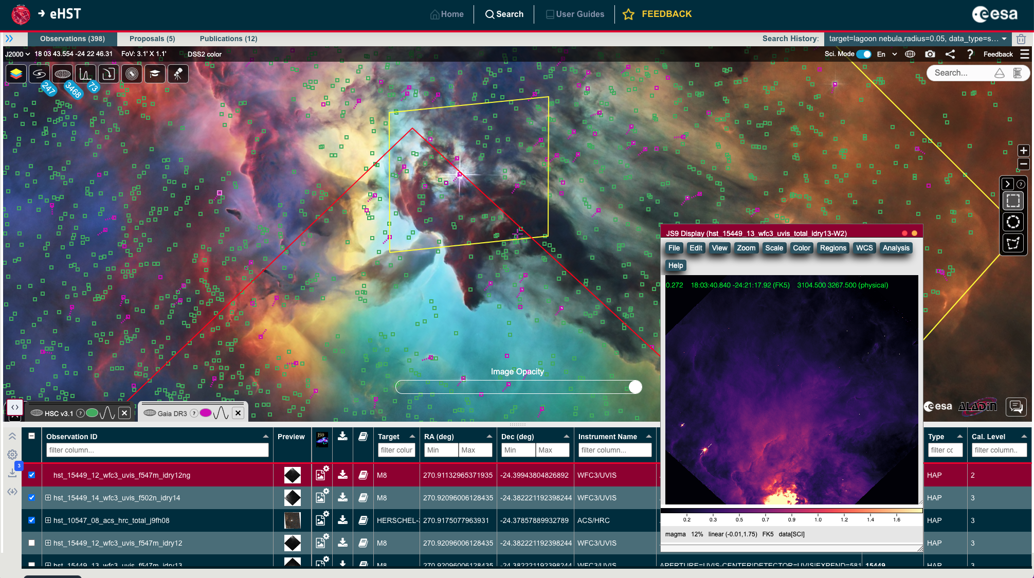 This is a screenshot from eHST showing the integration of ESASky with Hubble data footprints and files for a target of interest; the subset panel is the image visualisation tool for one of the selected files.