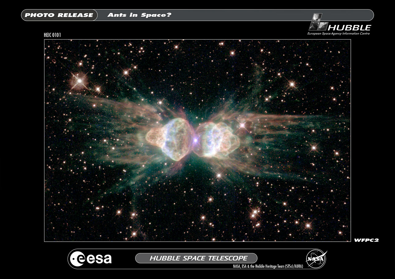 From ground-based telescopes, the so-called "ant nebula" (Menzel 3, or Mz 3) resembles the head and thorax of a garden-variety ant. This dramatic NASA/ESA Hubble Space Telescope image, showing 10 times more detail, reveals the "ant's" body as a pair of fiery lobes protruding from a dying, Sun-like star.