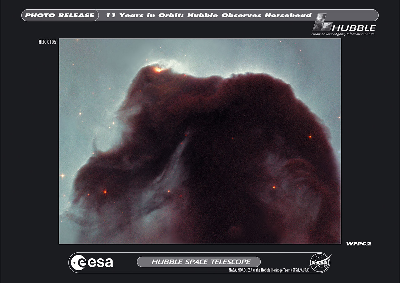 Rising from a sea of dust and gas like a giant seahorse, the Horsehead nebula is one of the most photographed objects in the sky. NASA/ESA Hubble Space Telescope took a close-up look at this heavenly icon, revealing the cloud's intricate structure. This detailed view of the horse's head is being released to celebrate the orbiting observatory's eleventh anniversary. Produced by the Hubble Heritage Project, this picture is a testament to the Horsehead's popularity. Internet voters selected this object for the orbiting telescope to view.