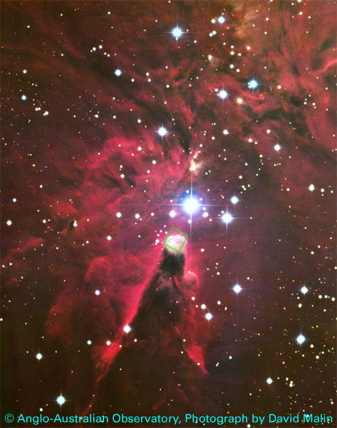 Ground-Based Visible-Light Image of the Cone Nebula With Outline of the NICMOS Infrared-Light Image.