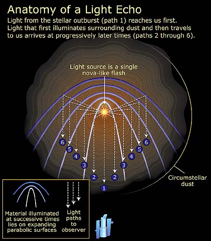 This diagram explains the anatomy of a light eco. Light from the stellar outburst (path 1) reaches us first. Light that first illuminates surrounding dust and then travels to us arrives at progressively later times (paths 2 through 6).