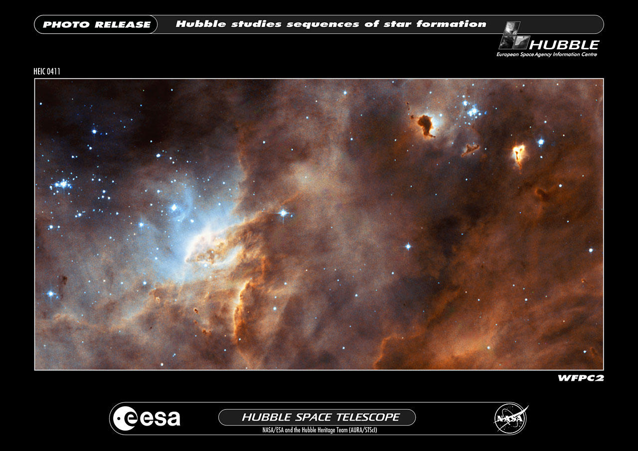 The NASA/ESA Hubble Space Telescope captures the iridescent tapestry of star birth in a neighbouring galaxy in this panoramic view of glowing gas, dark dust clouds, and young, hot stars. The star-forming region, catalogued as N11B lies in the Large Magellanic Cloud (LMC), located only 160,000 light-years from Earth. With its high resolution, the Hubble Space Telescope is able to view details of star formation in the LMC as easily as ground-based telescopes are able to observe stellar formation within our own Milky Way galaxy.