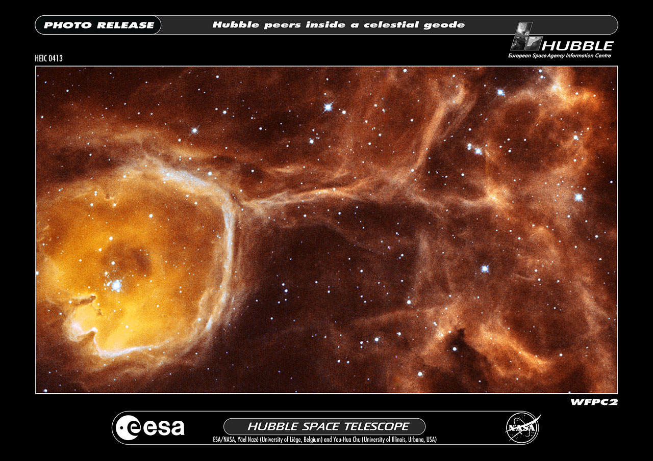 In this unusual image, the NASA/ESA Hubble Space Telescope captures a rare view of the celestial equivalent of a geode - a gas cavity carved by the stellar wind and intense ultraviolet radiation from a young hot star.