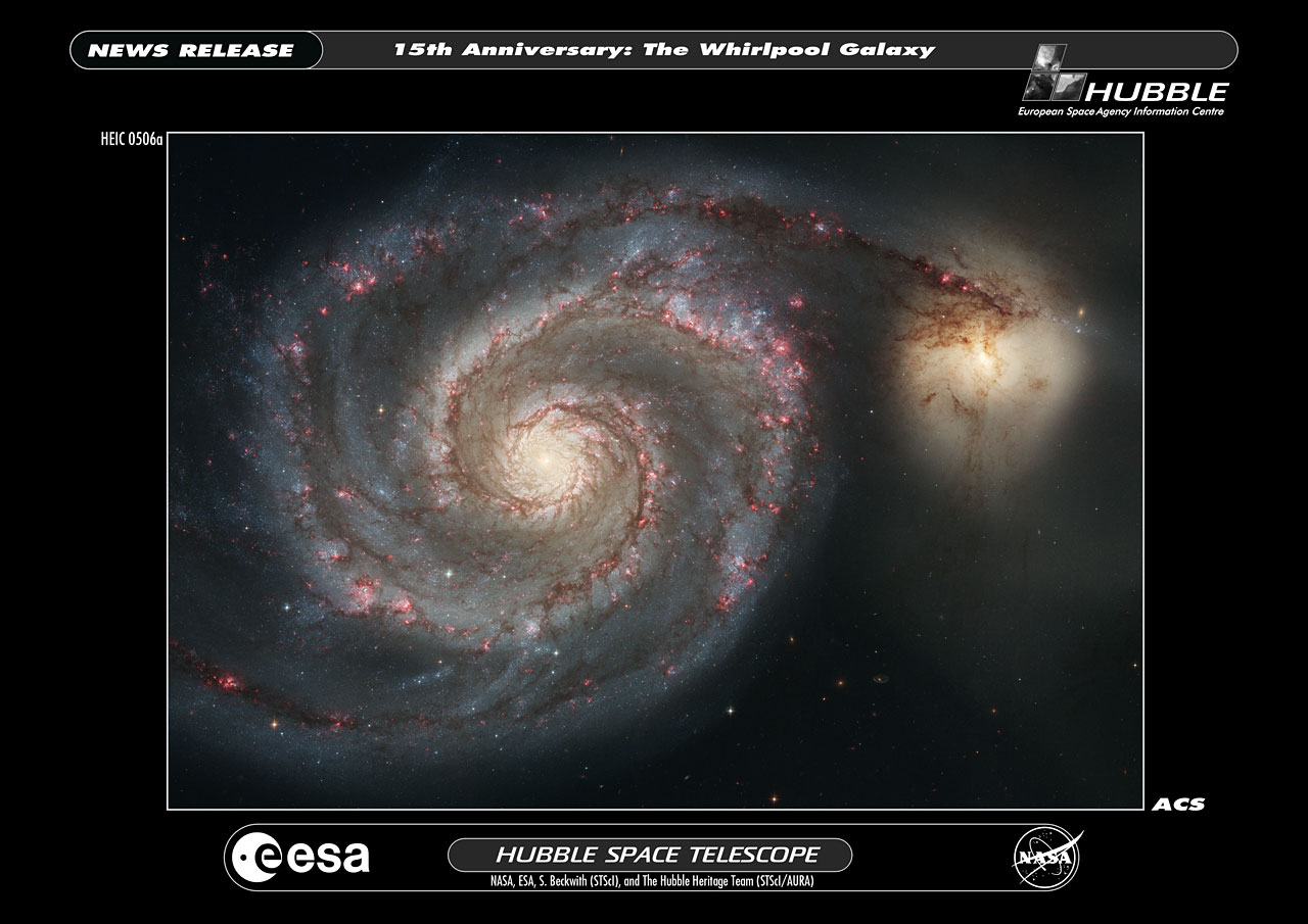This sharpest-ever image, taken in January 2005 with the Advanced Camera for Surveys aboard the NASA/ESA Hubble Space Telescope, illustrates a spiral galaxy's grand design, from its curving spiral arms, where young stars reside, to its yellowish central core, a home of older stars. The galaxy is nicknamed the Whirlpool because of its swirling structure.