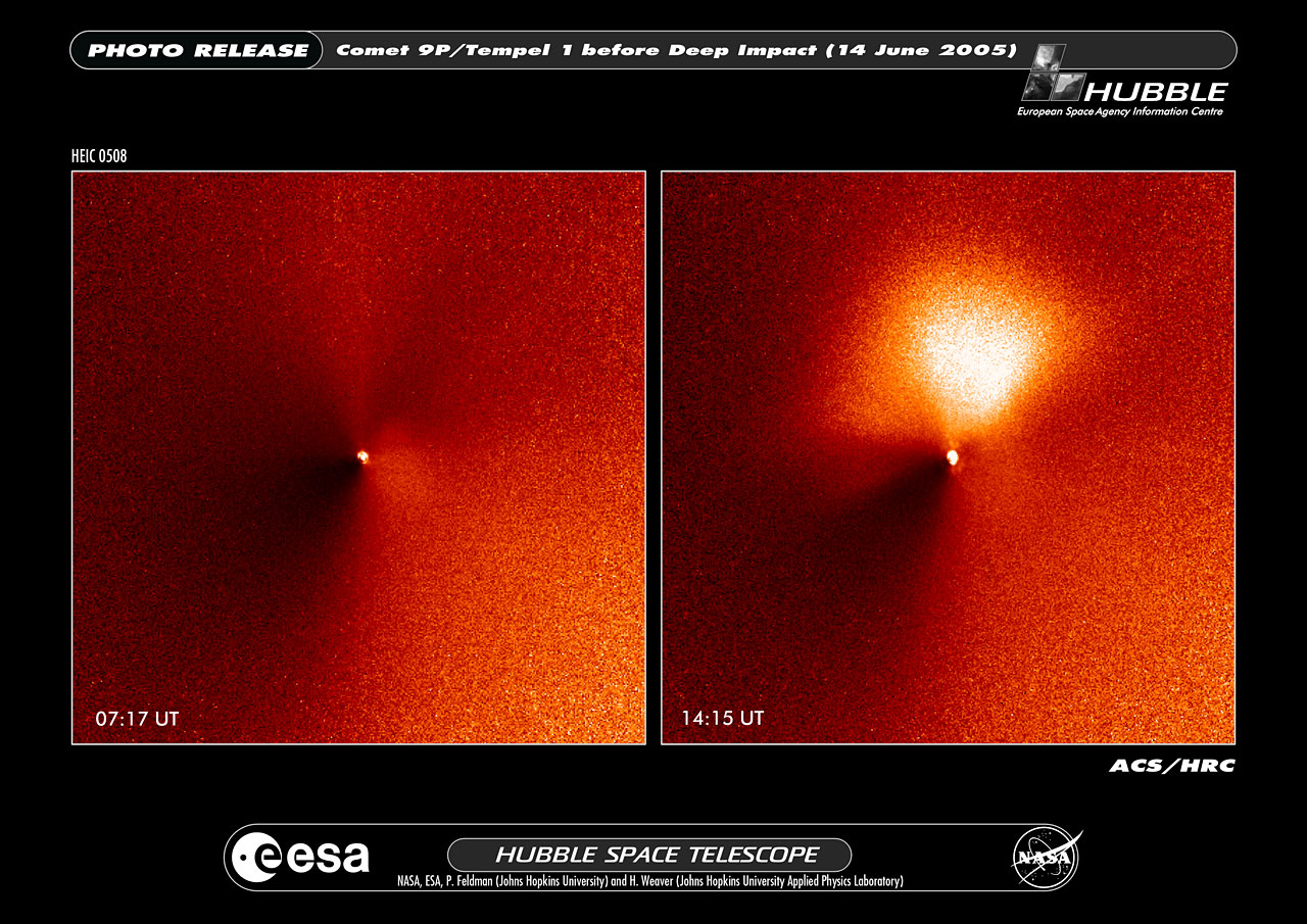 The two images, taken seven hours apart on 14 June, show Tempel 1 and its new jet. The image at left, taken at 7:17 a.m. (UT), is a view of the comet before the outburst. The bright dot is light reflecting from the comet's nucleus, which appears star-like in these images because it is too small even for Hubble to resolve. The nucleus, a potato-shaped object, is 14 kilometres wide and 4 kilometres long. Hubble's viewing the nucleus is as difficult as someone trying to spot a potato in Stockholm from Madrid.