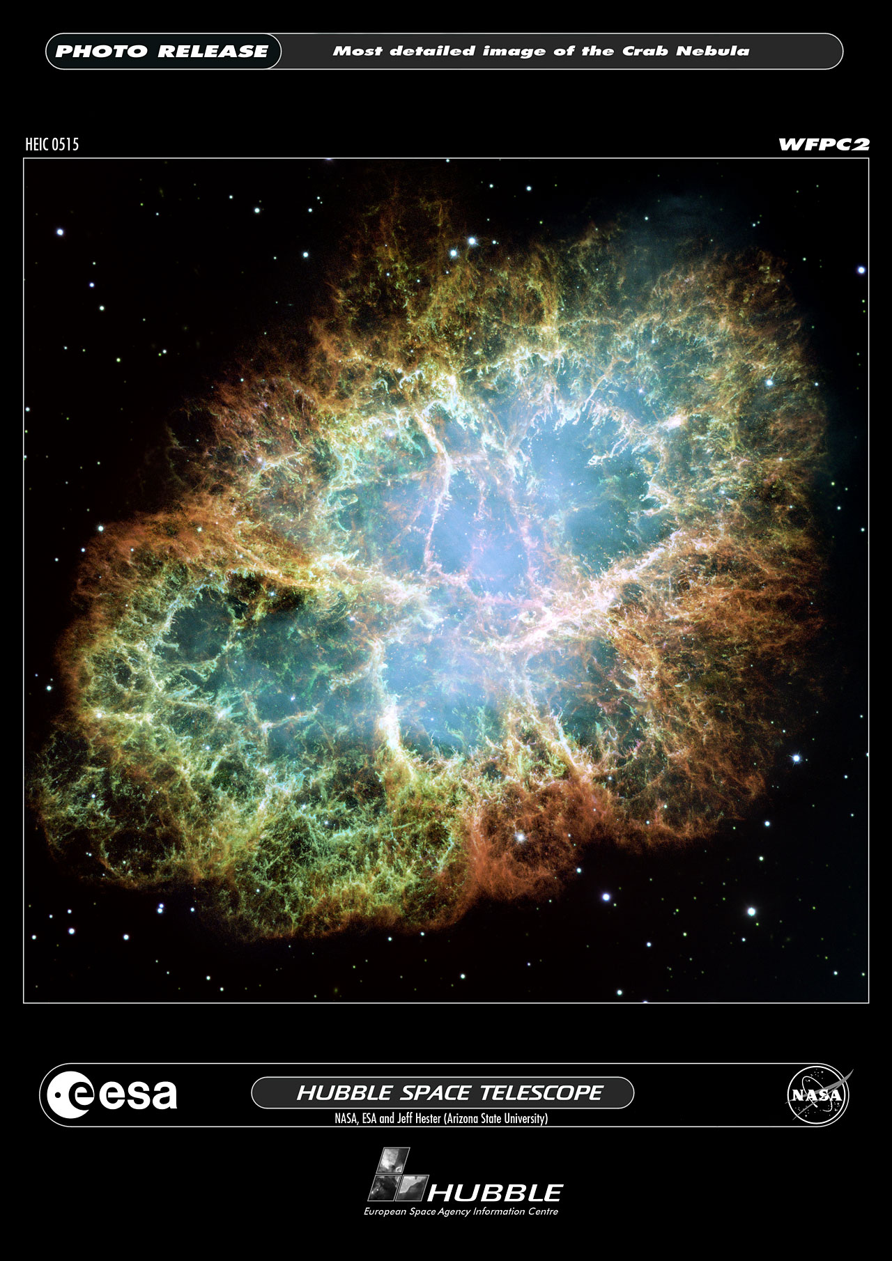 This image is the largest image ever taken with Hubble's WFPC2 camera. It was assembled from 24 individual exposures taken with the NASA/ESA Hubble Space Telescope and is the highest resolution image of the entire Crab Nebula ever made.