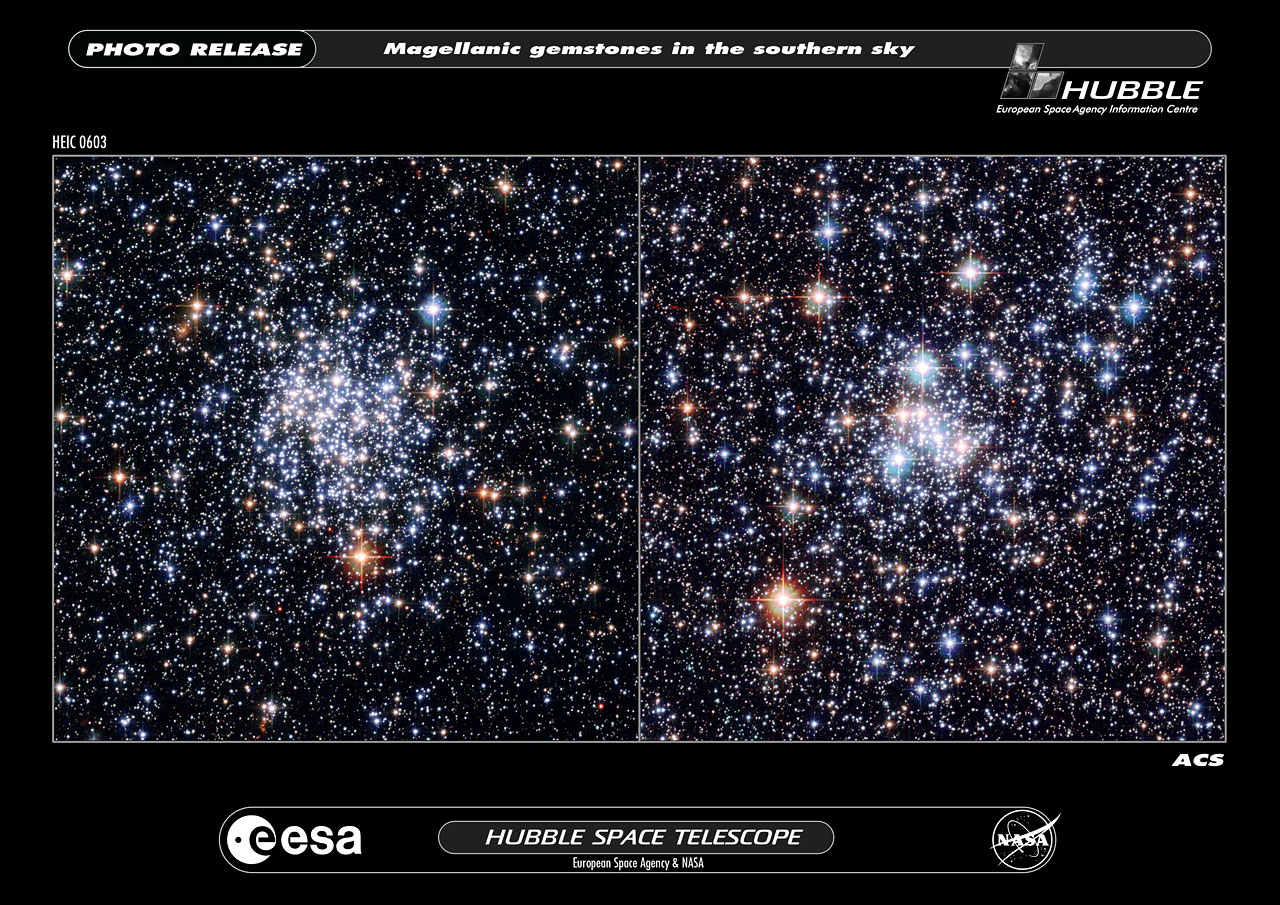 Two new composite images taken with the Advanced Camera for Surveys onboard the NASA/ESA Hubble Space Telescope show a myriad of stars in crystal clear detail. The brilliant open star clusters, NGC 265 and NGC 290, are located about 200,000 light-years away and are roughly 65 light-years across.