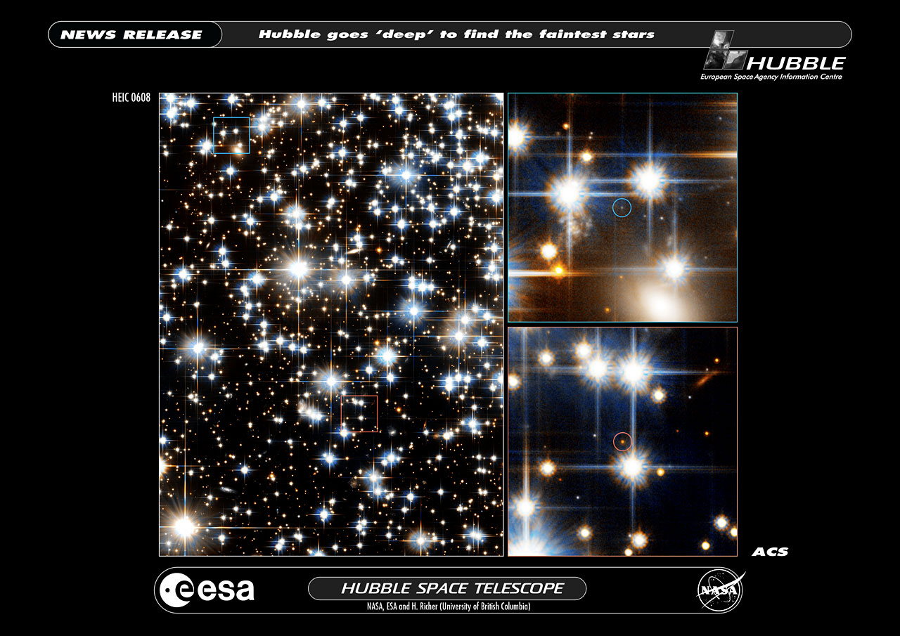 The image at lower right shows the faintest red dwarf star (the red dot within the red circle) spied by Hubble.