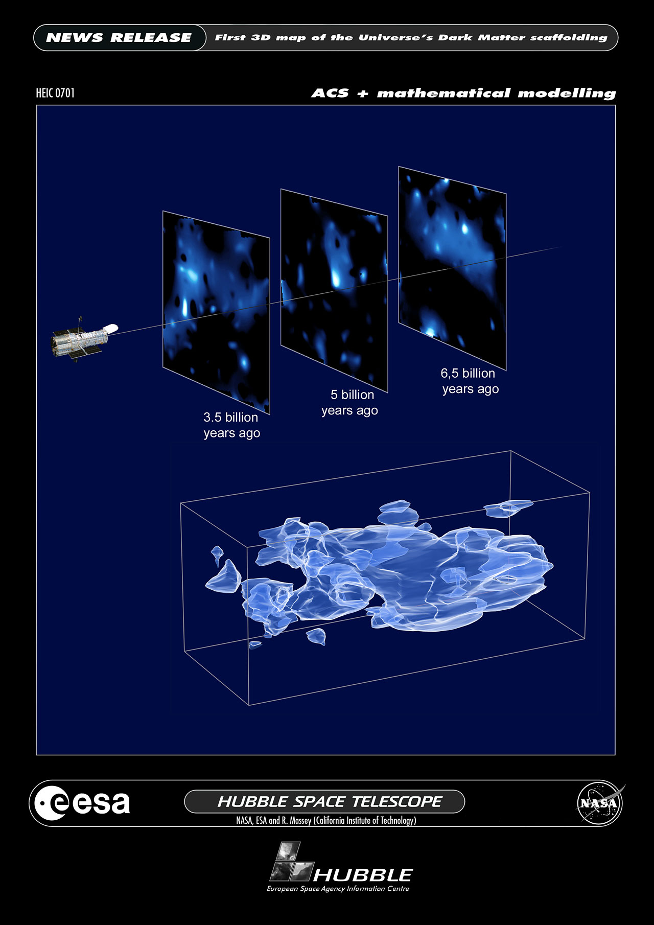 This three-dimensional map offers a first look at the web-like large-scale distribution of dark matter, an invisible form of matter that accounts for most of the Universe's mass. This milestone takes astronomers from inference to direct observation of dark matter's influence in the Universe. Because of the finite speed of light, regions furthest away are also seen as they existed a long time ago. The map stretches halfway back in time to the beginning of the Universe.