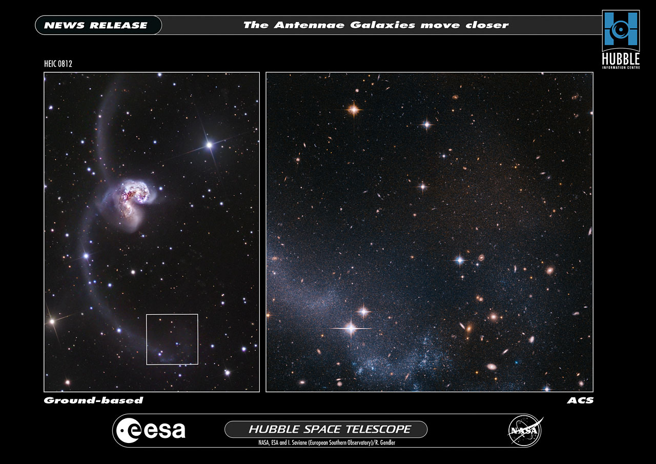 The ground-based image (left) is taken by Robert Gendler and shows the two merging galaxies and their impressive long tidal tails.