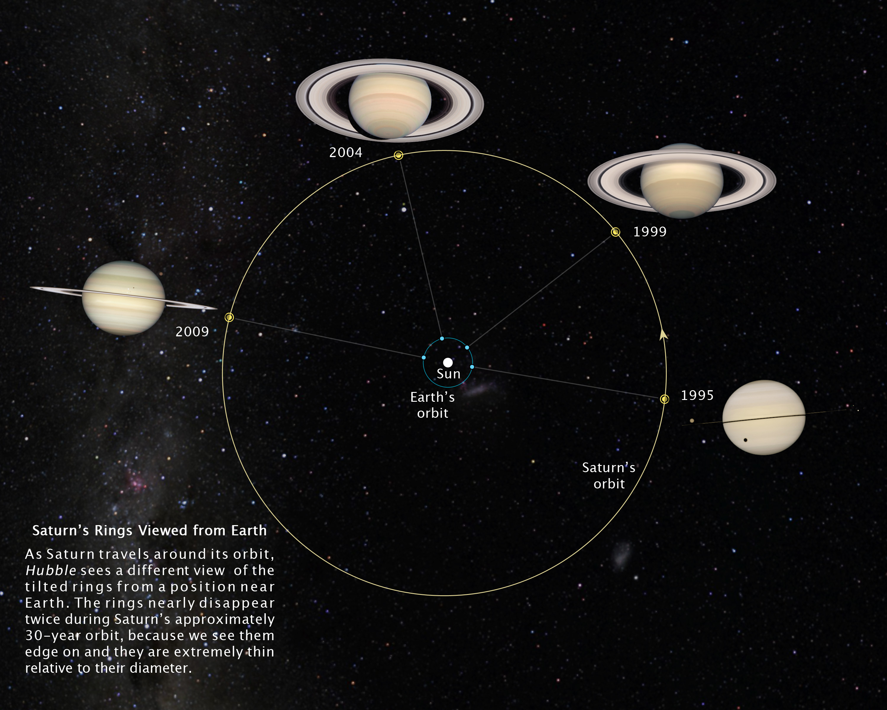 As Saturn travels around its orbit, Hubble sees a different view of the tilted rings from a position near Earth. The rings nearly disappear twice during Saturn's approximately 30-year orbit, because we see them edge on and they are extremely thin relative to their diameter.