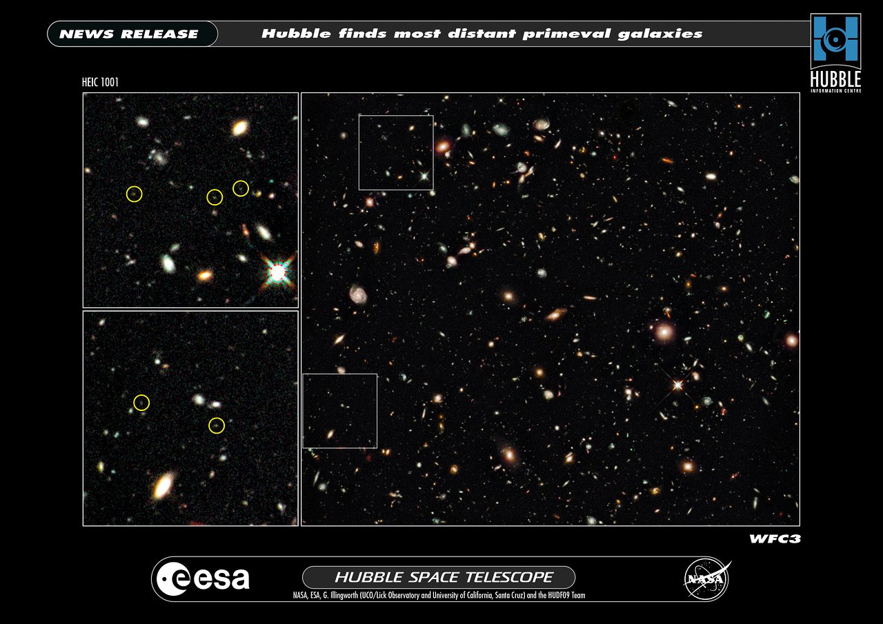 This is the deepest image of the Universe ever taken in near-infrared light by the NASA/ESA Hubble Space Telescope. The faintest and reddest objects (left inset) in the image are galaxies that correspond to lookback times of approximately 12.9 billion years to 13.1 billion years. No galaxies have been seen before at such early epochs. These galaxies are much smaller than the Milky Way galaxy and have populations of stars that are intrinsically very blue. This may indicate the galaxies are so primordial that they are deficient in the heavier elements, and as a result, are quite free of the dust that reddens light through scattering.
