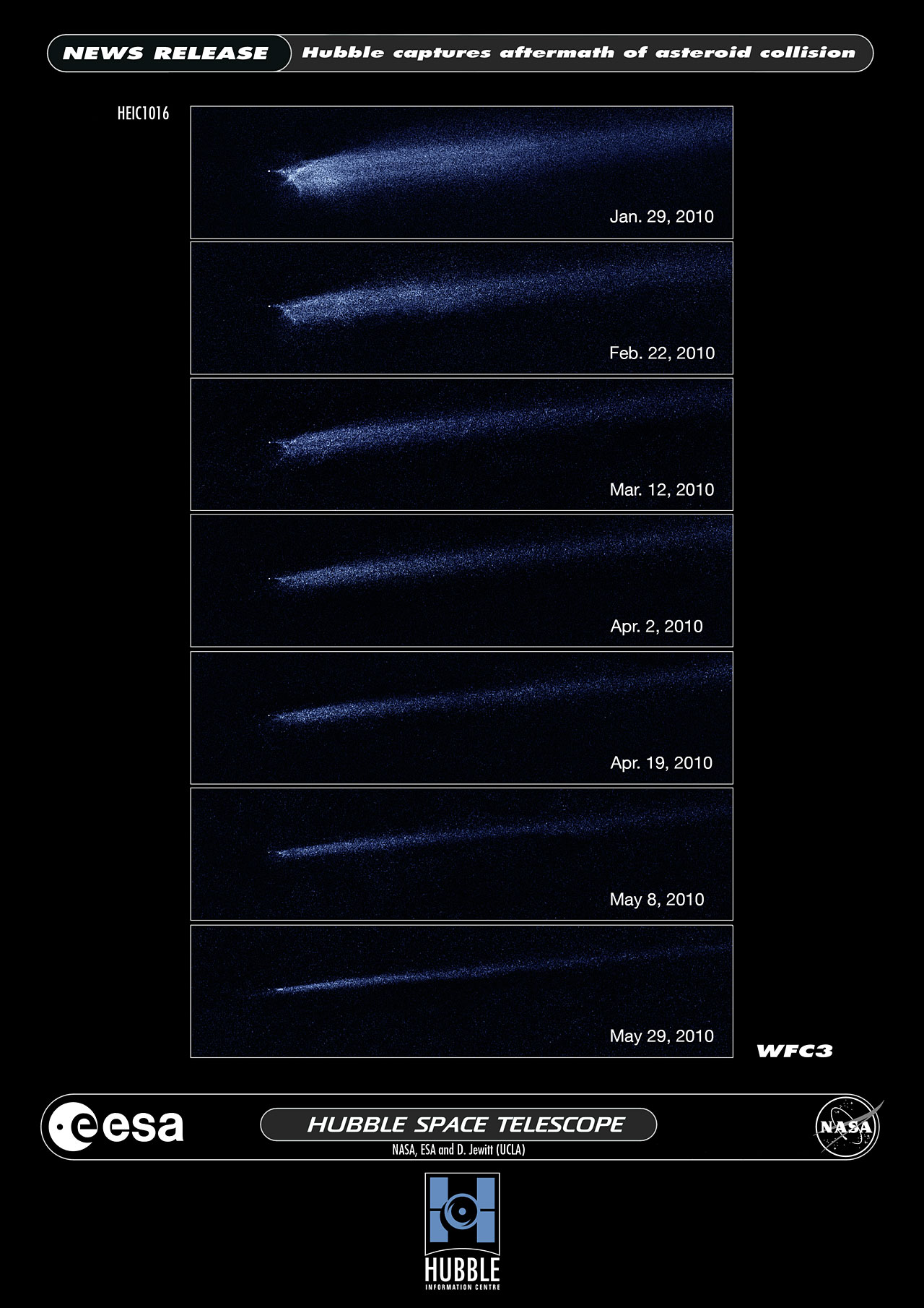 This series of images taken by Hubble’s Wide Field Camera 3 clearly shows the slow evolution of the debris coming from asteroid P/2010 A2, which is thought to be due to a collision with a smaller asteroid.