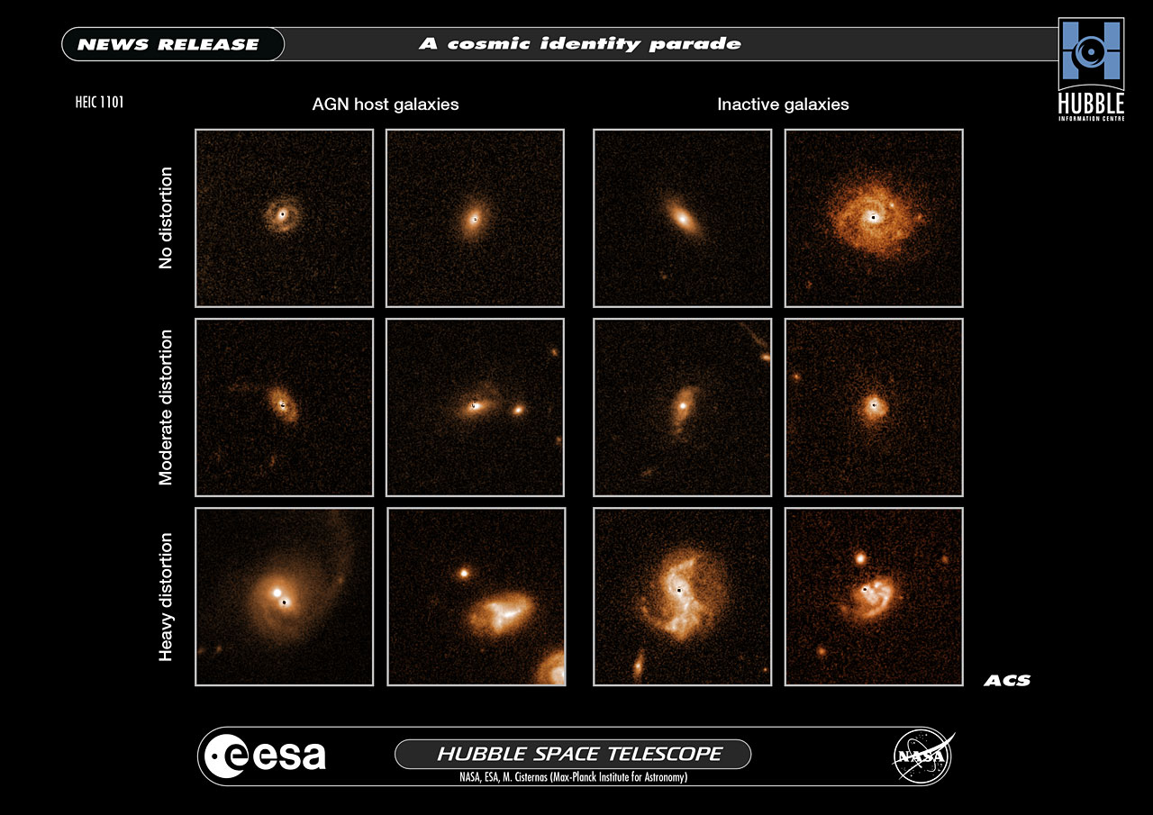 A team of astronomers studied over 1400 galaxies snapped by Hubble in the COSMOS survey, to test the hypothesis that galactic mergers trigger active galactic nuclei (AGN). In order to make this a blind test, the team modelled and removed the active nucleus (which normally appears as a bright spot) from each galaxy, and then cosmetically added a similar mark to the galaxies without an AGN, to make them visually indistinguishable. This explains the black dot visible near the centre of each of these images.