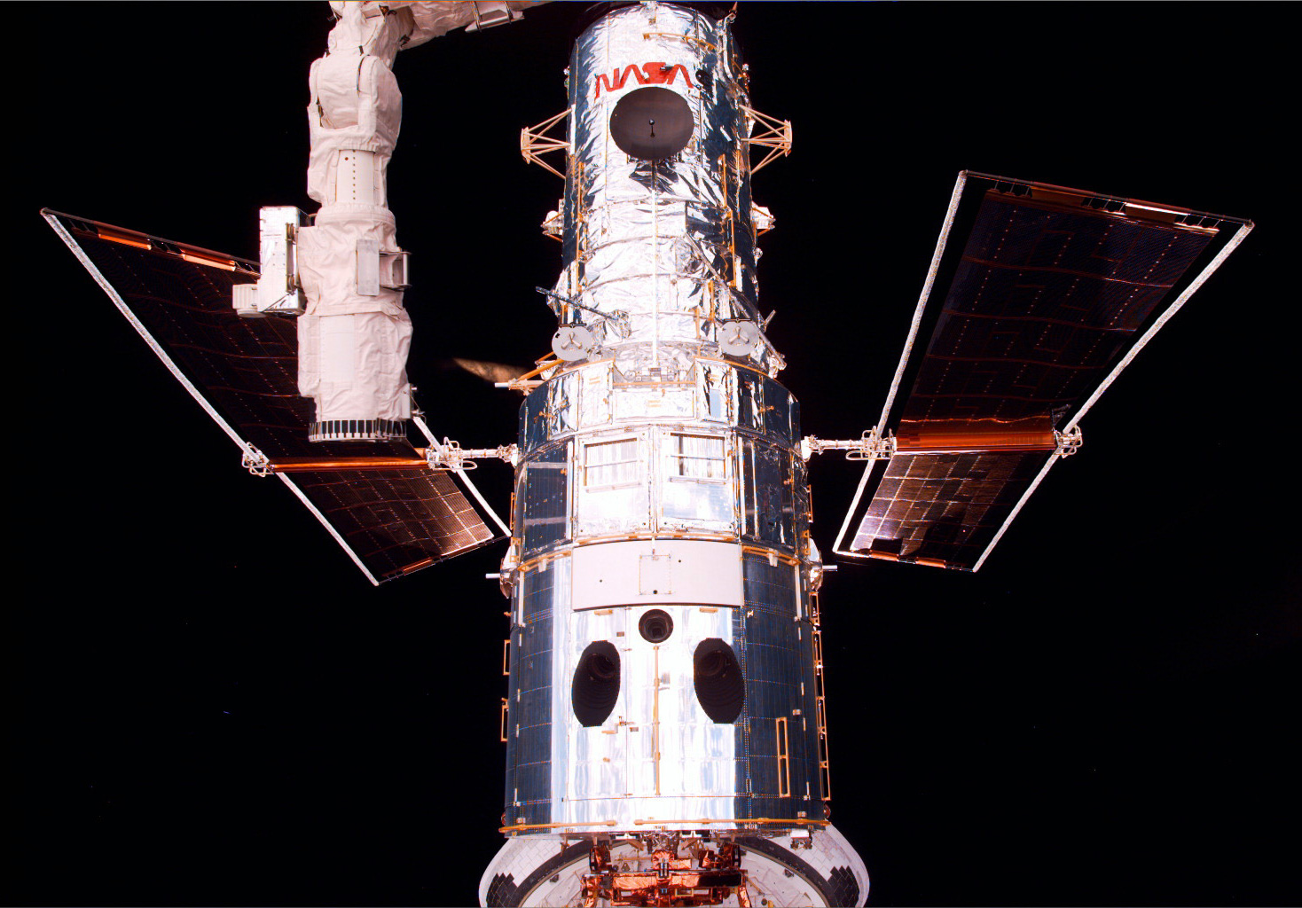 Hubble Space Telescope after capture berthed on Flight Support System (FSS) in Space Shuttle Discovery's payload bay.