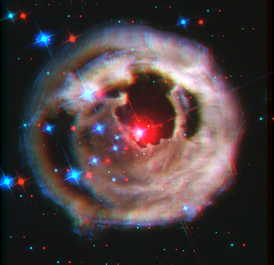 Gas around V838 Monocerotis, nova-like star, seemed to be expanding faster than light from the earth. Why ? You might be able to see "light echo" through this piece of art. http://www.spacetelescope.org/images/html/heic0304d.html . Original Photo Credit: NASA, European Space Agency, and H.E. Bond (STScI)