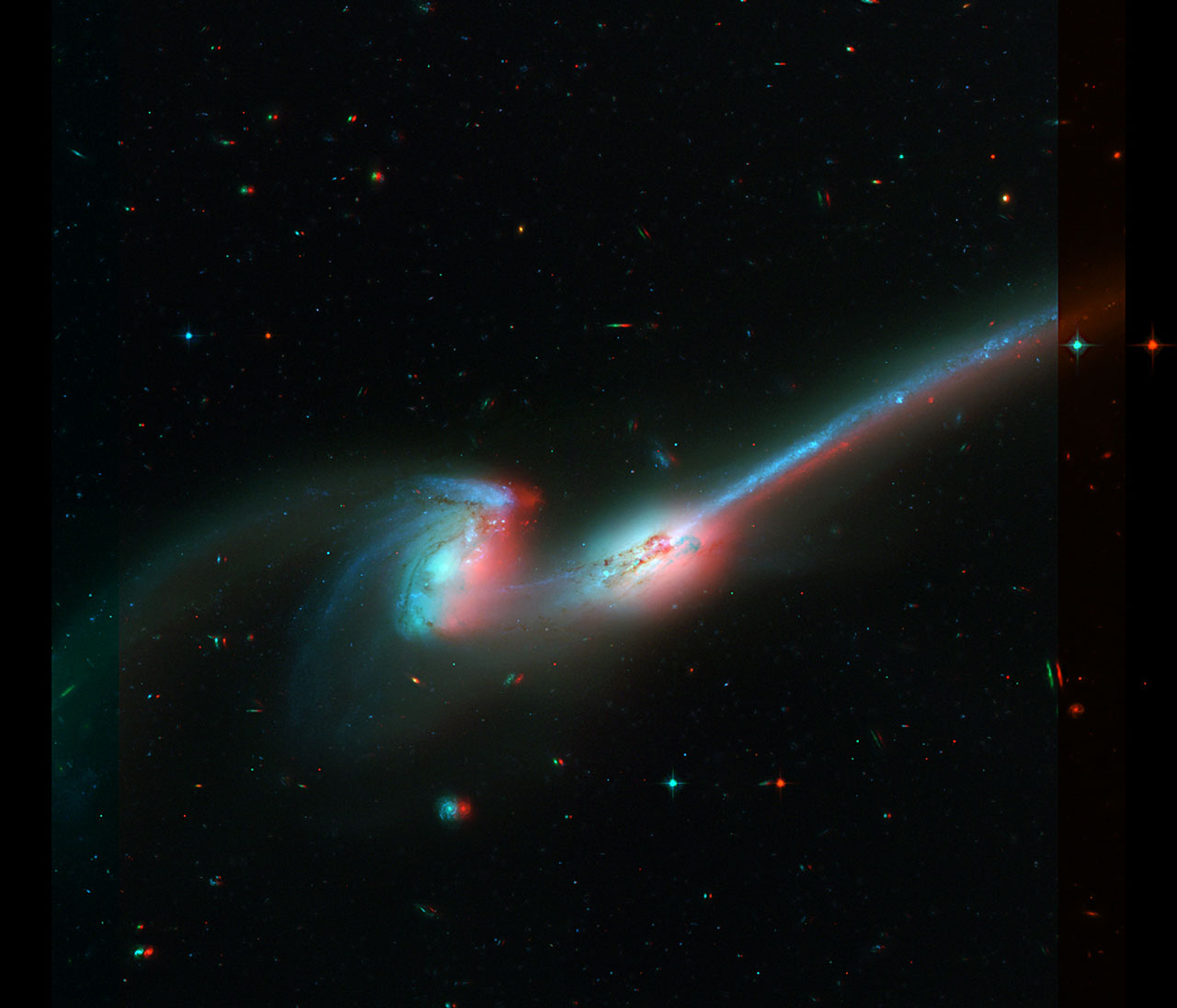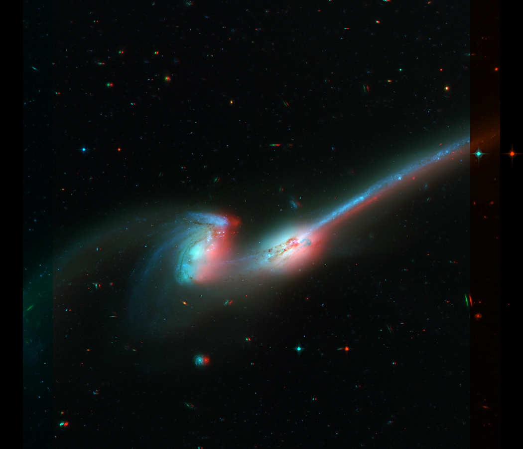 After almost face-on galaxy and almost edge-on galaxy meet and passed, astronomers are simulating, the mice galaxy woulde be made. http://www.spacetelescope.org/images/html/heic0206b.html . Original Photo Credit: NASA, Holland Ford (JHU), the ACS Science Team and ESA