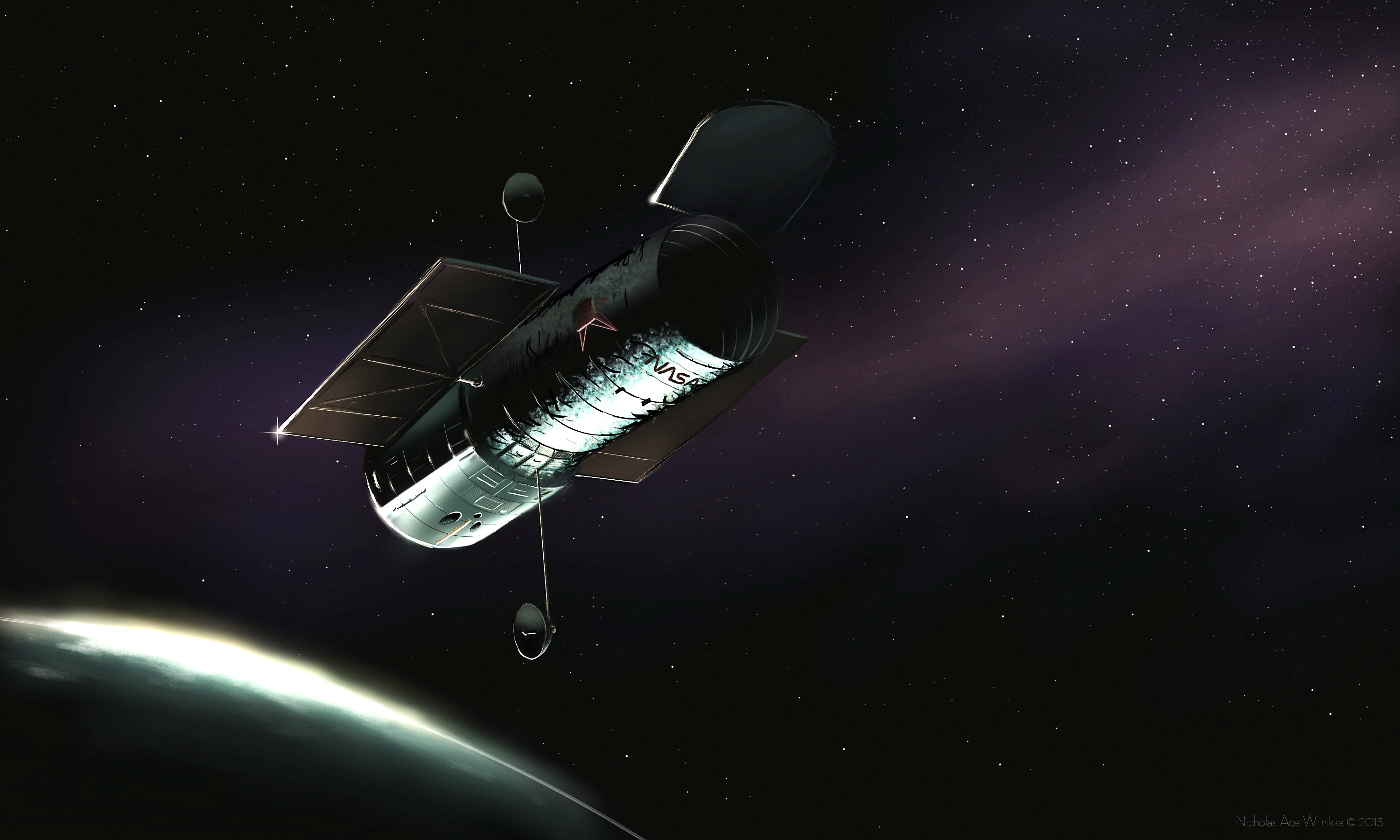 A digital painting of the Hubble Space Telescope, inspired by its past, present and future discoveries.