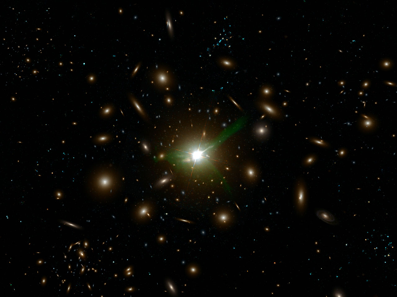 The whole universe is streaked by cosmic webs of galaxy clusters. At the knot points of these accumulations there are the largest galaxies generally. This picture shows an enormous D-galaxy devouring a gas-ritch companion. Like M87, this monster has also high energetic jets.