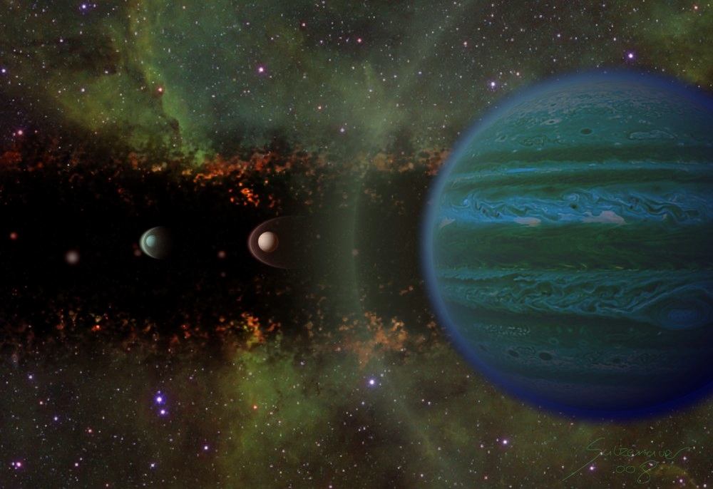 In this picture you are able to see inside a planetary birth place. Many gas giants are swirling around a sun-like star. Most of these planets will collide or shut out of the system. If two protoplanets collide, the radiation from the star will strip off their gas and a rocky (maybe earth-like) planet will remain. The planets are surrounded by a bow shock of loose, ionised gas.