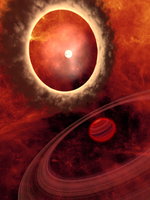 This picture shows the last moments of circumstellar disk around a sun-like star. The offender is a brown dwarf. When this encounter ends, new planets will remain.