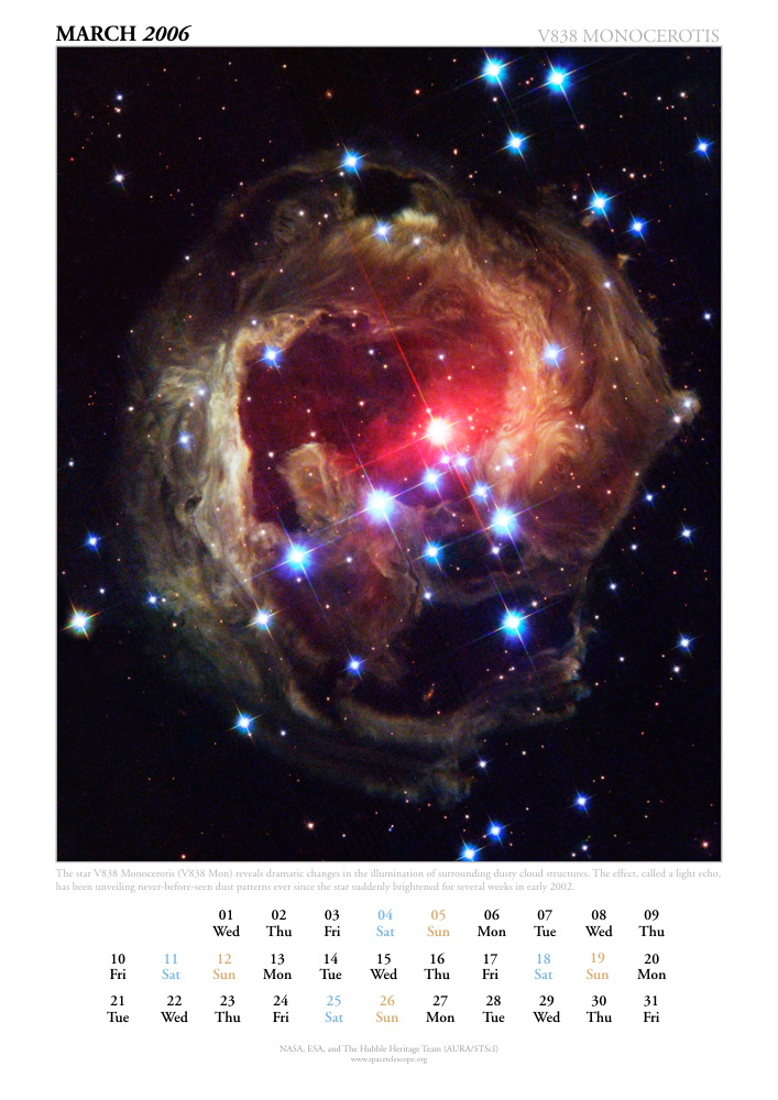 The star V838 Monocerotis (V838 Mon) reveals dramatic changes in the illumination of surrounding dusty cloud structures. The effect, called a light echo, has been unveiling never-before-seen dust patterns ever since the star suddenly brightened for several weeks in early 2002.