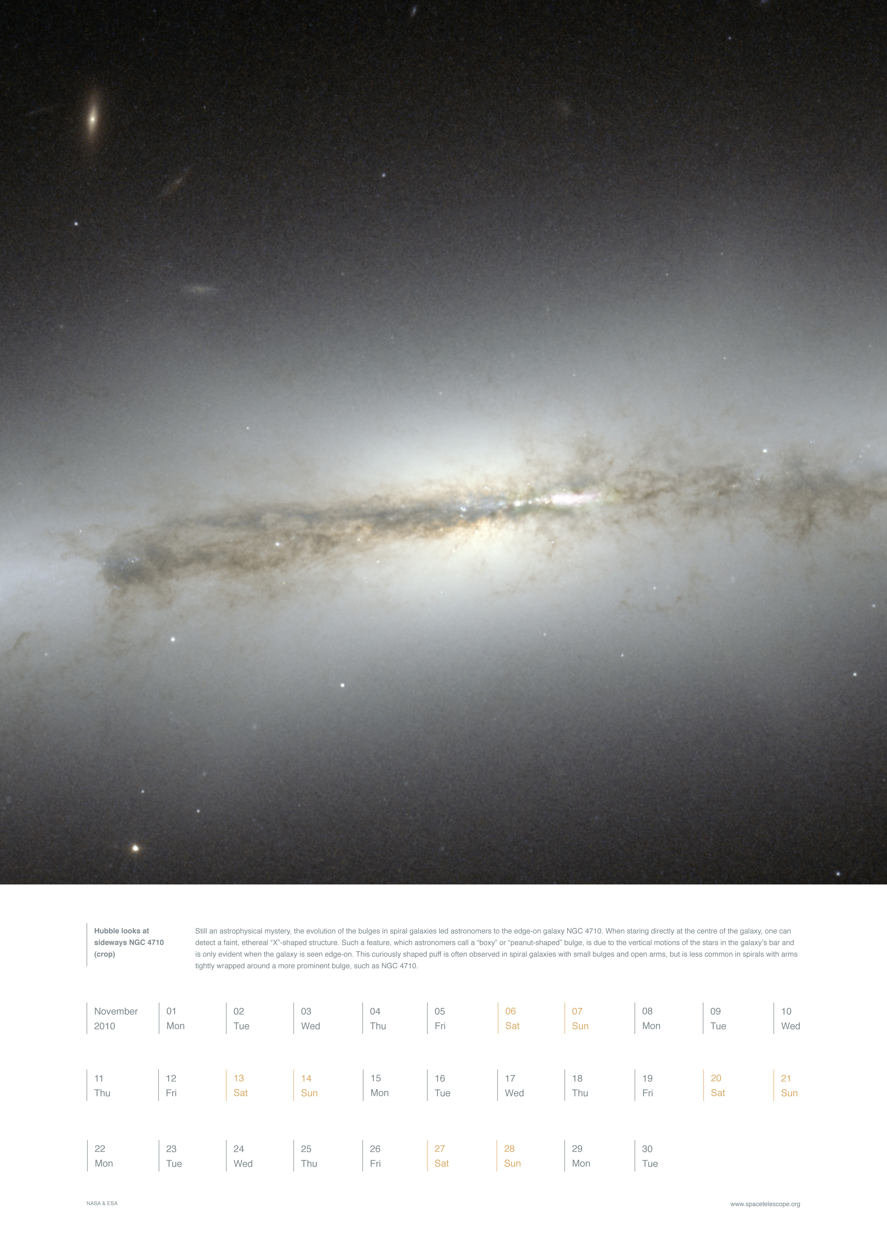 Still an astrophysical mystery, the evolution of the bulges in spiral galaxies led astronomers to the edge-on galaxy NGC 4710. When staring directly at the centre of the galaxy, one can detect a faint, ethereal "X"-shaped structure. Such a feature, which astronomers call a "boxy" or "peanut-shaped" bulge, is due to the vertical motions of the stars in the galaxy's bar and is only evident when the galaxy is seen edge-on. This curiously shaped puff is often observed in spiral galaxies with small bulges and open arms, but is less common in spirals with arms tightly wrapped around a more prominent bulge, such as NGC 4710.