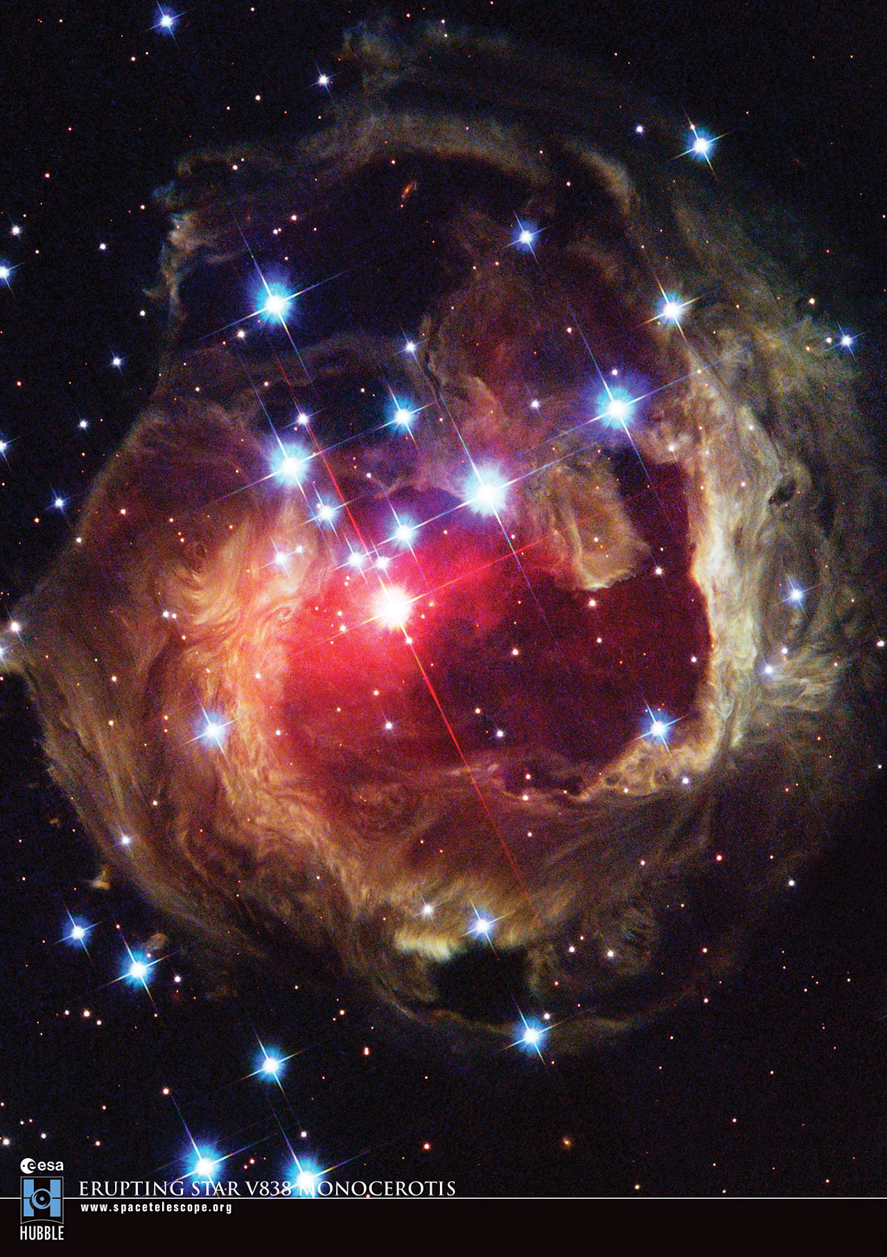 The Hubble telescope has imaged V838 Mon and its light echo several times since the star's outburst in 2002. Each time Hubble observes the event, different thin sections of the dust are seen as the pulse of illumination continues to expand away from the star at the speed of light, producing a constantly changing appearance. Read more about the image here.