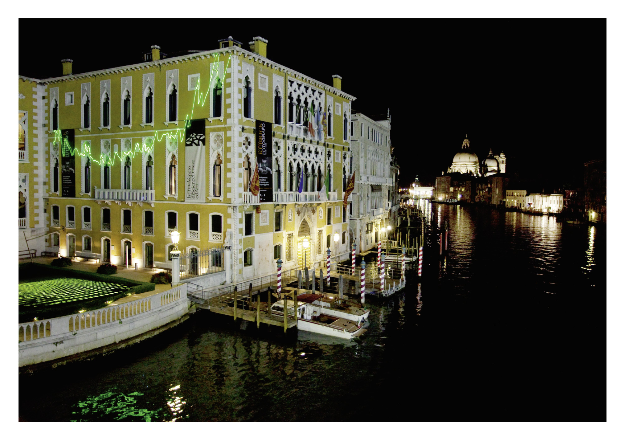 A breathtaking laser installation by artist Tim Otto Roth on Venice’s Palazzo Franchetti. While the scanning green laser might appear abstract, it is in fact based on Hubble observations of distant galaxies.