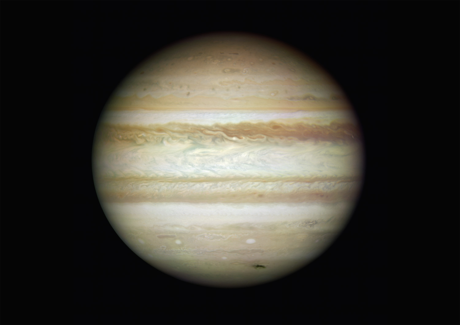 The dark smudge at bottom right is debris from a comet or asteroid that plunged into Jupiter’s atmosphere and disintegrated. In addition to the fresh impact, the image reveals a spectacular variety of shapes in the swirling atmosphere of Jupiter. The planet is wrapped in bands of yellow, brown and white clouds. These bands are produced by the atmosphere flowing in different directions at various places. When these opposing flows interact, turbulence appears. Read more about this image here.
