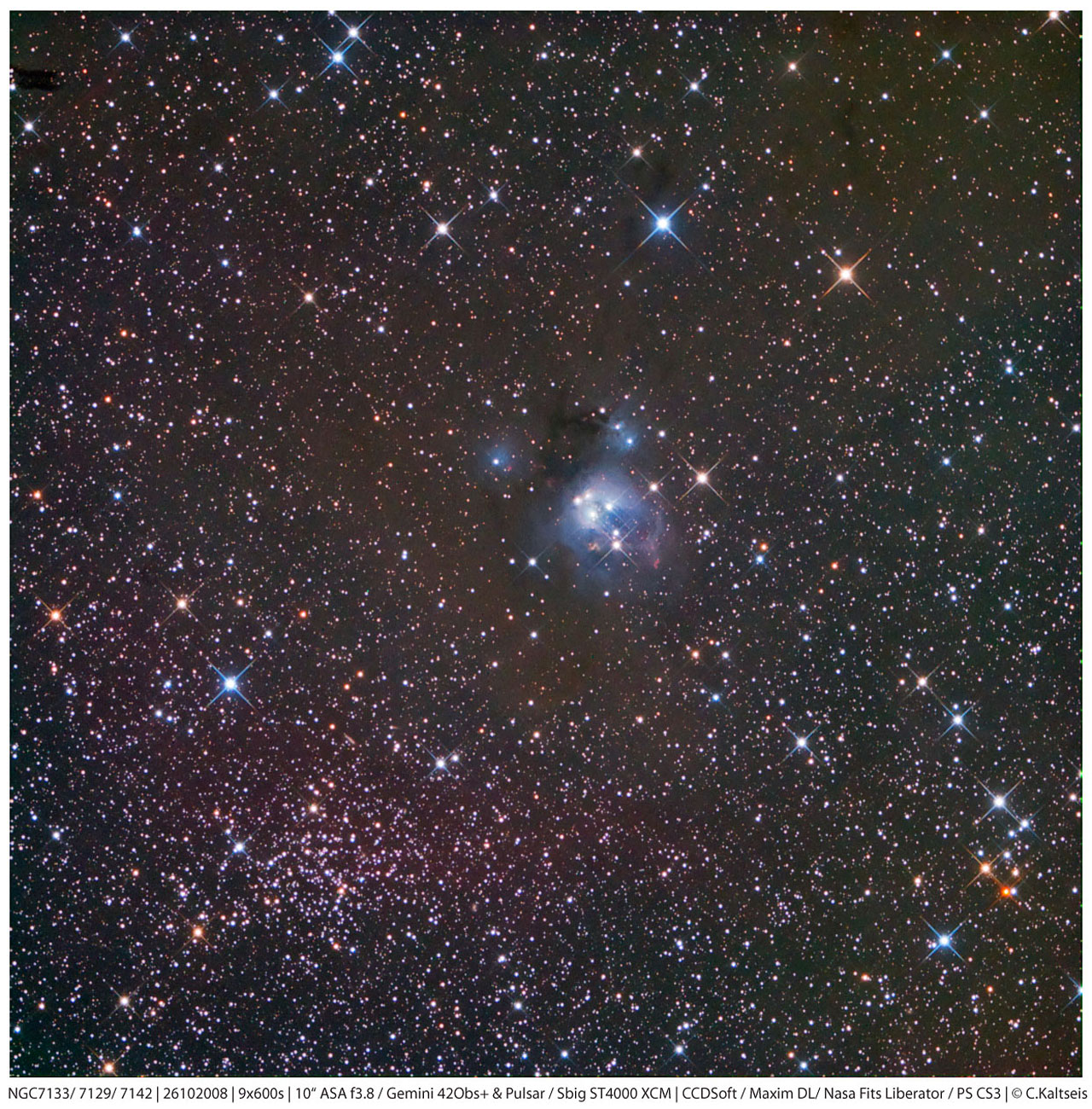 This image shows NGC7133/ NGC7129/ NGC7142 taken at the observatory Sternwarte Gahberg. Christoph captured the image using 10" ASA f3.8N, Sbig St4000XCM (color ccd), Gemini Mount 42 Obs+, with an exposure time of 90 minutes. Processed using Maxim DL, the ESA/ESO/NASA Photoshop FITS Liberator, PS CS3