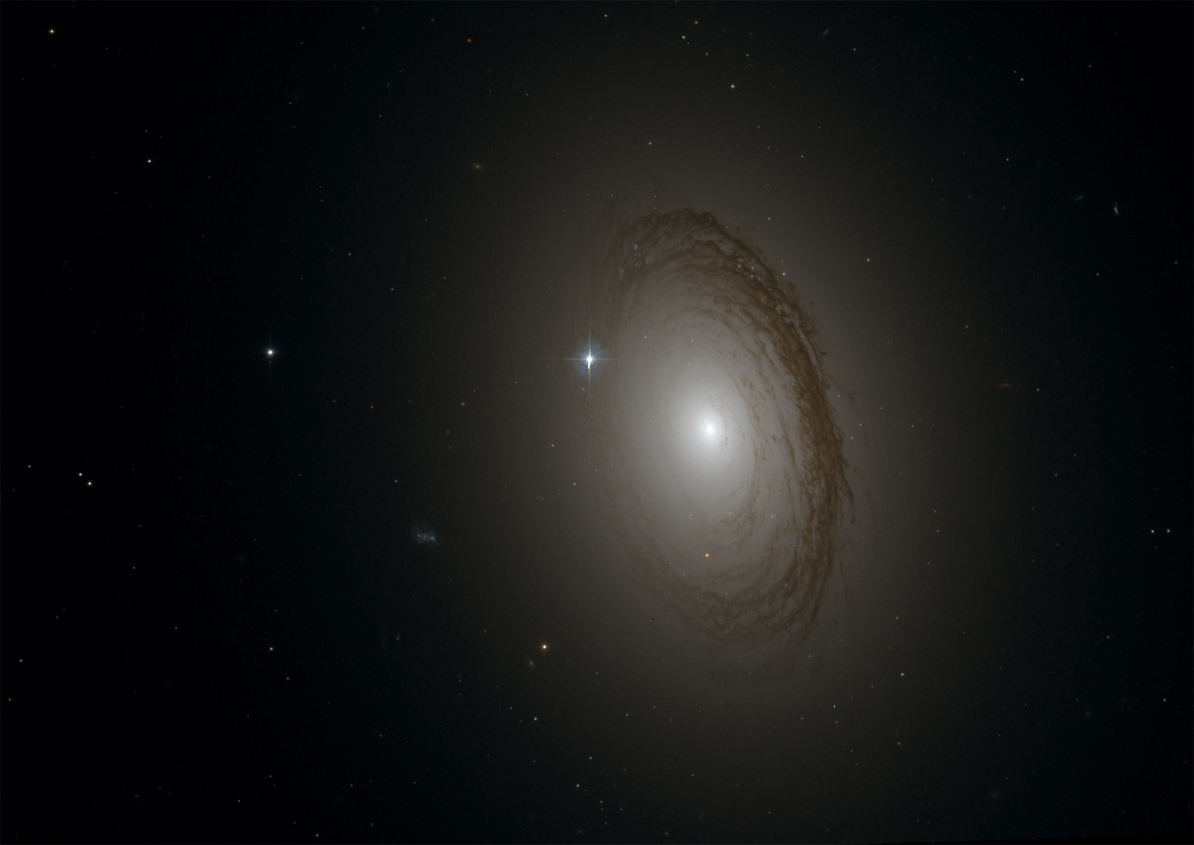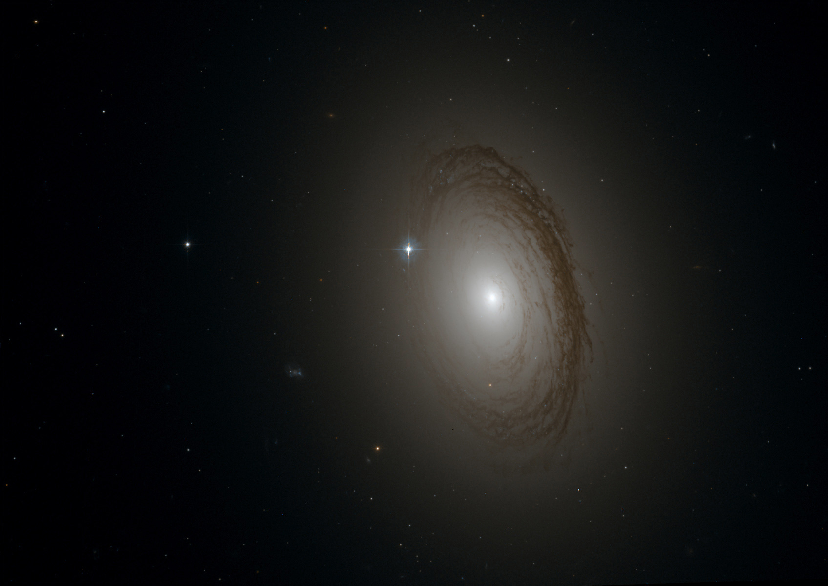 Seen here is NGC 7049, the brightest of a three-galaxy system, whose dark dust lanes block the light of it's inner stars and give it a structure that has elements of both a elliptical galaxy and a spiral galaxy. It lies 100 million light years away and spans about 100,000 light years in diameter. This image was taken with the Hubble Space Telescope's Advanced Camera for Surveys (ACS) using two wide-band filters (F435W and F814W) in March of 2003 and obtained from the Hubble ESO/ST-ECF Archives.
