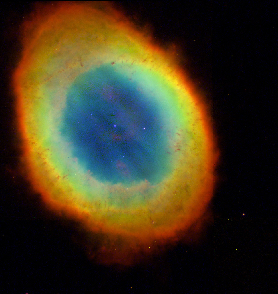 The colors of the spectrum shimmer brilliantly in concentric rings that expand outward from the central white dwarf star that illuminates them. This planetary nebula is located about 2,300 light years from earth, and is also known as M57 or NGC6720. The image was created using three narrow band filters (F469N, F502N, and F658N) taken by the Hubble Space Telescope's Wide Field Planetary Camera 2 in April of 2008 and obtained from the Hubble ESO/ST-ECF Archive.