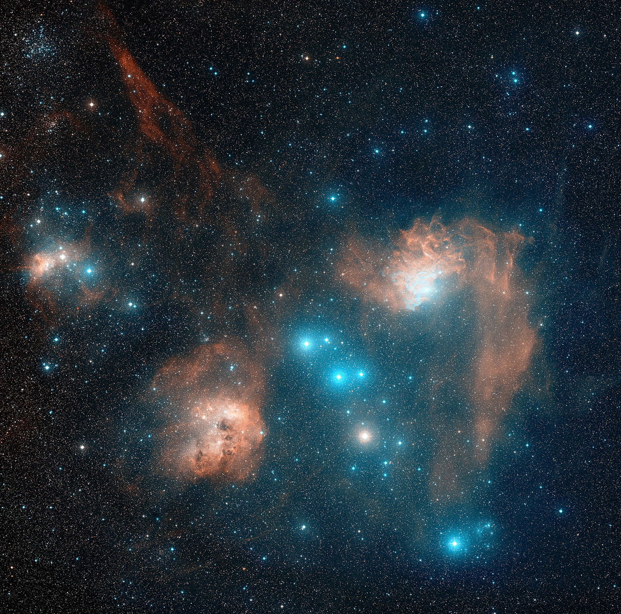 Rippling dust and gas lanes give the Flaming Star Nebula its name. The red and blue colors of the nebula are present in different regions and are created by different processes. The bright star AE Aurigae is so hot it is blue, emitting light so energetic it knocks electrons away from surrounding gas. When a proton recaptures an electron, red light is frequently emitted. The blue region's color is a mix of this red light and blue light emitted by AE Aurigae but reflected to us by surrounding dust. The two regions are referred to as emission nebula and reflection nebula, respectively. The Flaming Star Nebula, officially known as IC 405, lies about 1500 light years distant, spans about 5 light years, and is visible with a small telescope toward the constellation of Auriga. One and a half degree East from the Flaming Star Nebula is located IC 410, a region of faint nebulosity surrounding the open star cluster NGC 1893. The cluster itself is small and located just below center, underneath the central dust region of the nebula. This nebula contains complex wisps of gas and is a beautiful target for astrophotography. (Text adapted from Astronomy Picture of the Day). This image is a composite from black and white images taken with the Palomar Observatory's 48-inch (1.2-meter) Samuel Oschin Telescope as a part of the second National Geographic Palomar Observatory Sky Survey (POSS II). The images were recorded on two glass photographic plates - one sensitive to red light and the other to blue and later they were digitized. Credit: Caltech, Palomar Observatory, Digitized Sky Survey. In order to produce the color image seen here, I worked with a total of 56 different frames, 28 for each color band, coming from 4 different plates taken between 1988 and 1996. Original file is 11,144x9,801 pixels with a resolution of about 1 arcsec per pixel. The image show an area of sky large 3.1ø x 2.7ø (for comparison, the full-Moon is about 0.5ø in diameter).
