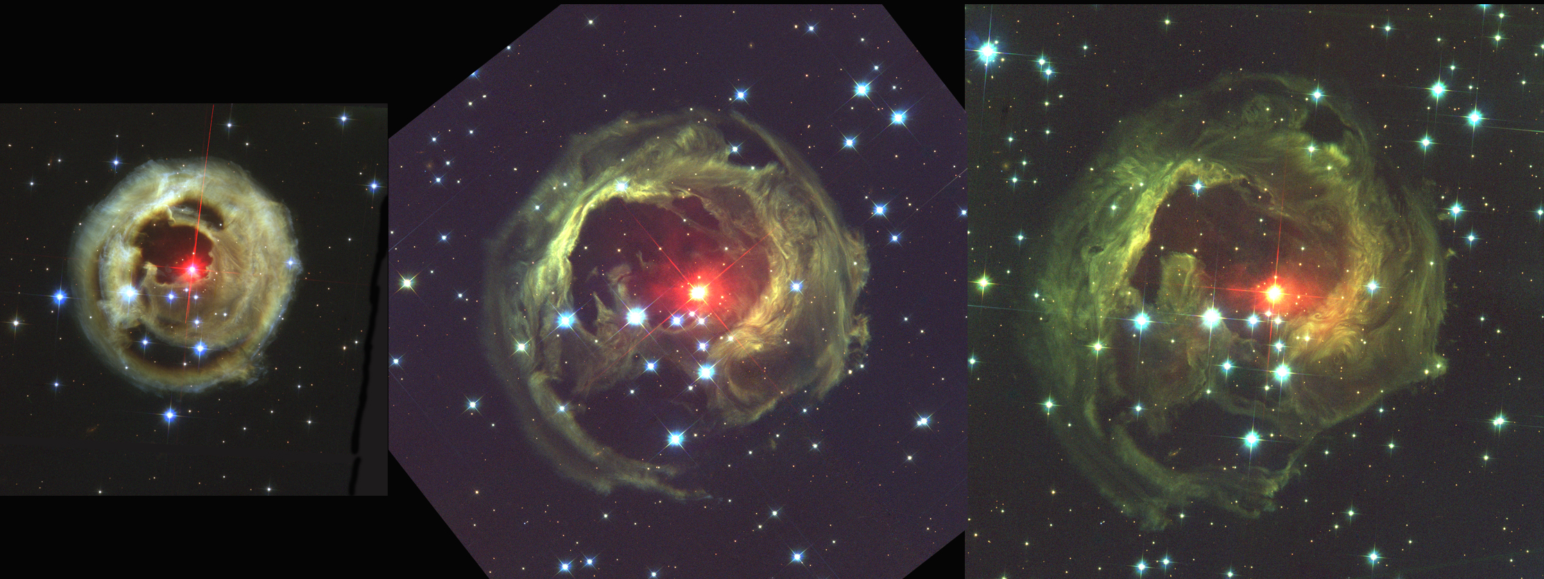Here is an image of V838 Mon. The three different views show the expanding light wave as it reflects off of shells of dust around the middle, bright red star. I used data from the Hubble Advanced Camera for Surveys and used the pyraf program to "drizzle" multiple datasets of the same filter together to remove cosmic rays. For the different layers, I used the following filters: F435W for blue, F606W for green, and F814W for red. I used the ASinH stretch for all images.