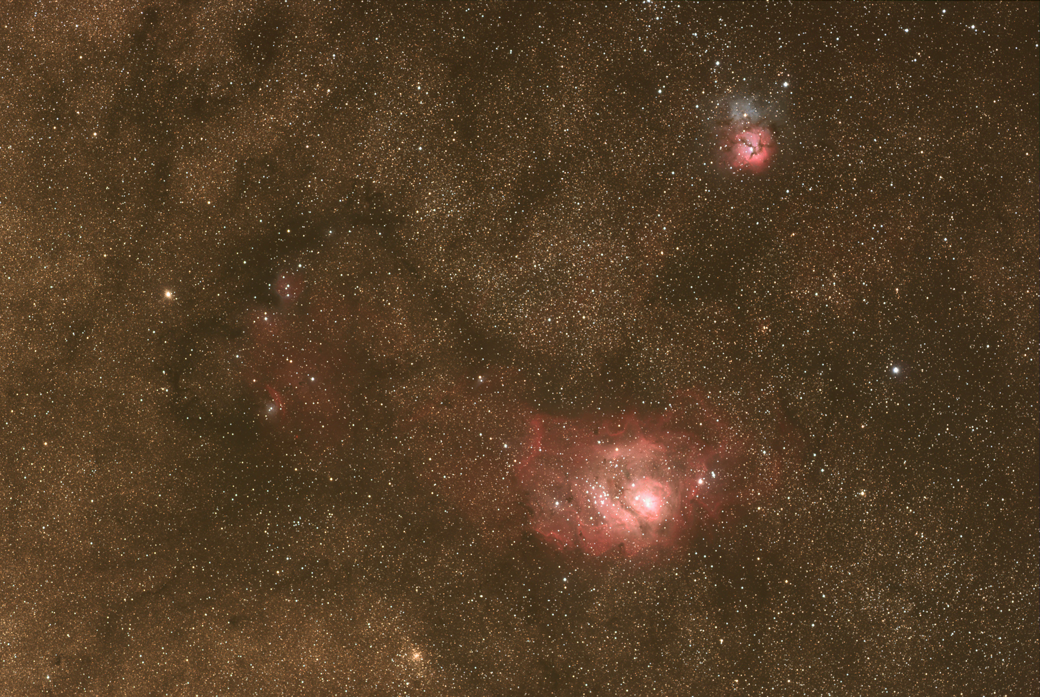 The starfield and dark nebulae around the Lagoon (Messier 8, below center) and Trifid Nebulae (Messier 20, upper right) in Sagittarius. Many thanks to amateur astrophotographers Jim Misti and Steve Mazlin for the image data. The only credit they request follows.